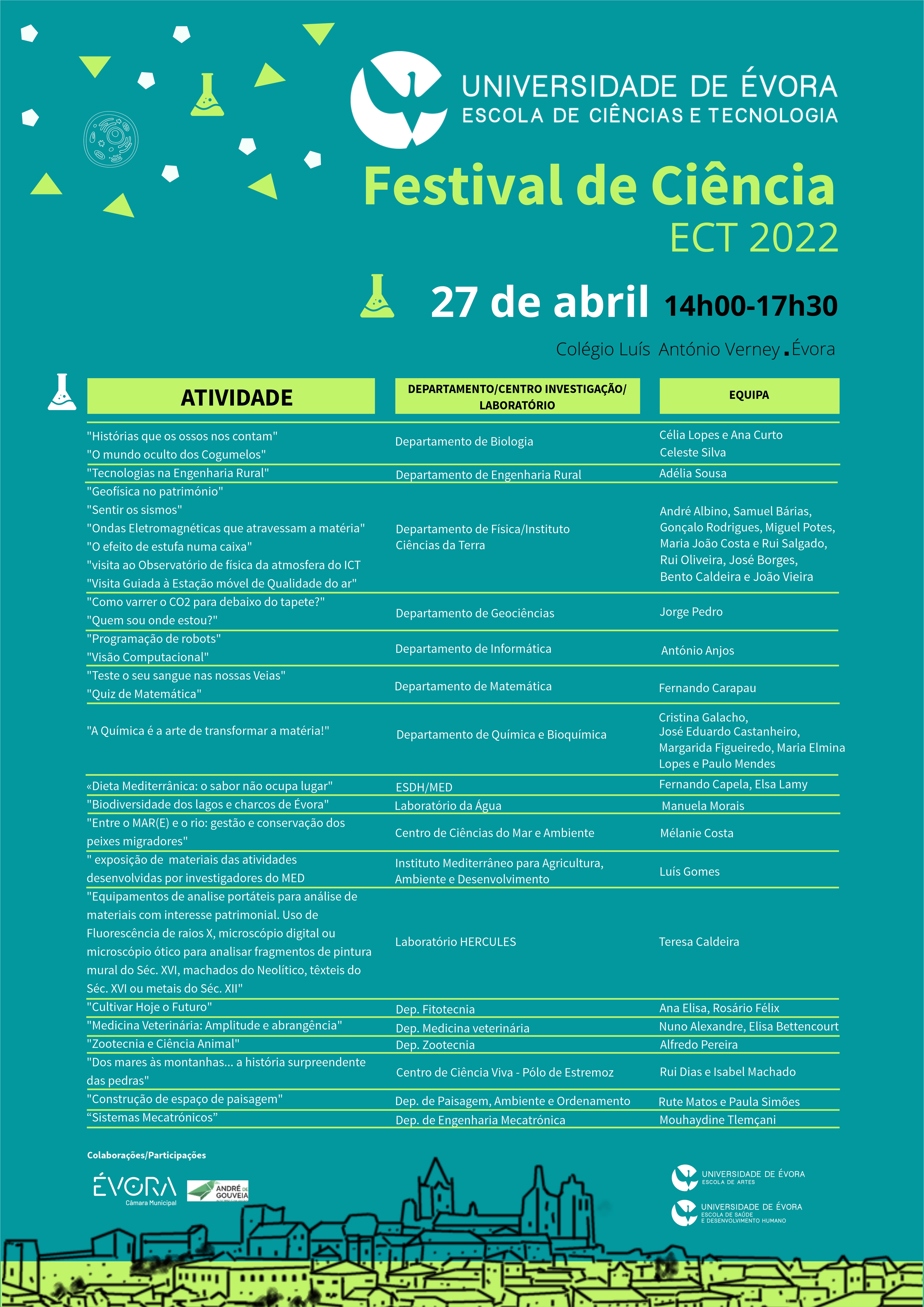 Para comemorar o dia da Escola de Ciências e Tecnologia, da Universidade de Évora realiza-se dia 27 de abril, no Colégio Luís António Verney, o Festival da Ciência '22, uma iniciativa de entrada livre com atividades para todas as idades, com o objetivo de "proporcionar aos jovens e ao público em geral oportunidades para explorar, simular, experimentar, discutir questões de interesse e preocupação científicas”.