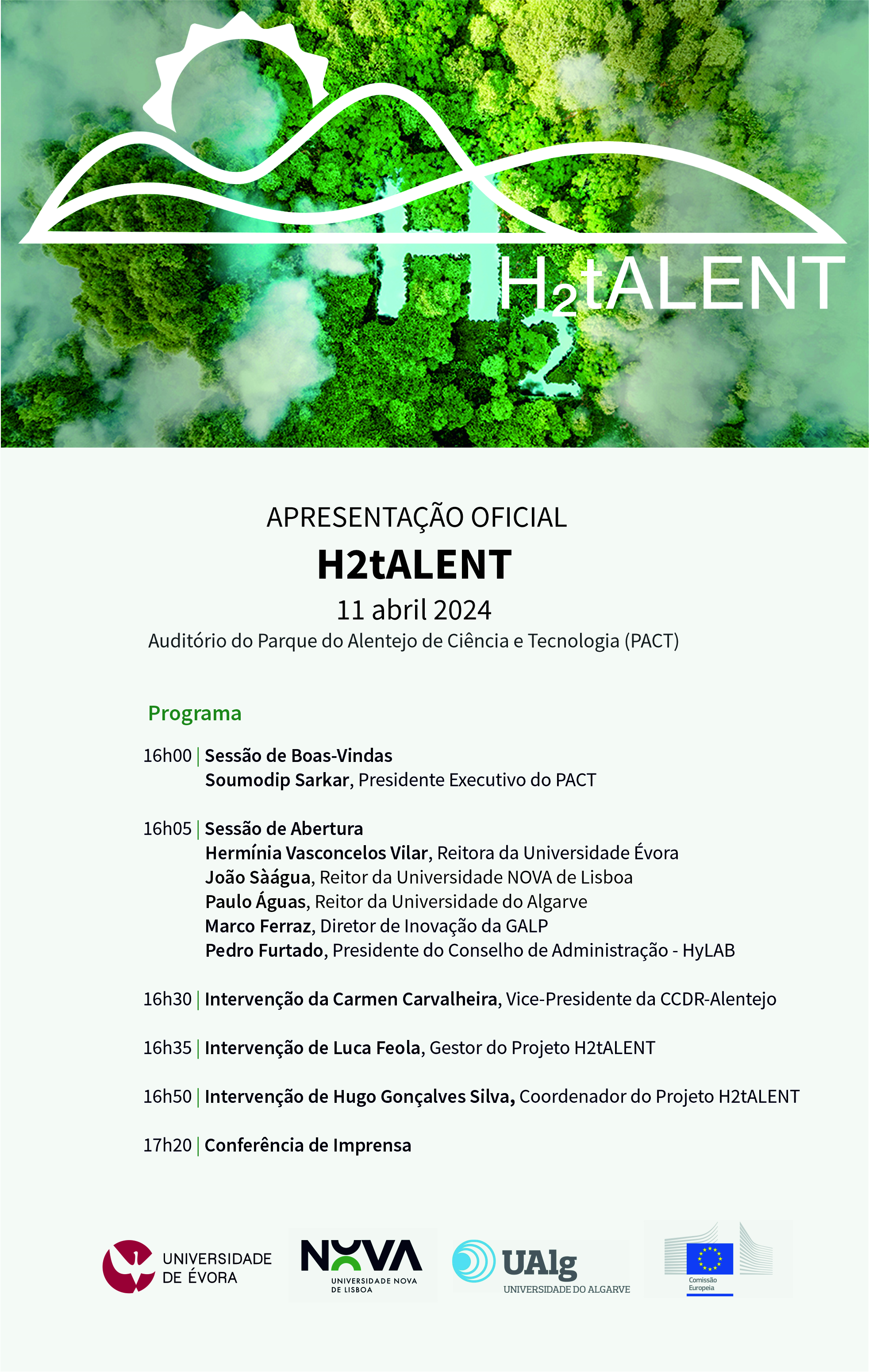 Liderado pelo Campus Sul – Associação Interuniversitária de que fazem parte a Universidade NOVA de Lisboa, a Universidade de Évora e a Universidade do Algarve, em parceria com a GALP e o Laboratório Colaborativo HYLAB, e Coordenado pela Universidade de Évora, o H2tALENT visa criar um ecossistema de inovação centrado no hidrogénio “verde” e no Alentejo. Este é o primeiro Vale de Hidrogénio Verde em Portugal com financiamento e reconhecimento da União Europeia e da Rede Global de Vales de Hidrogénio Verde.